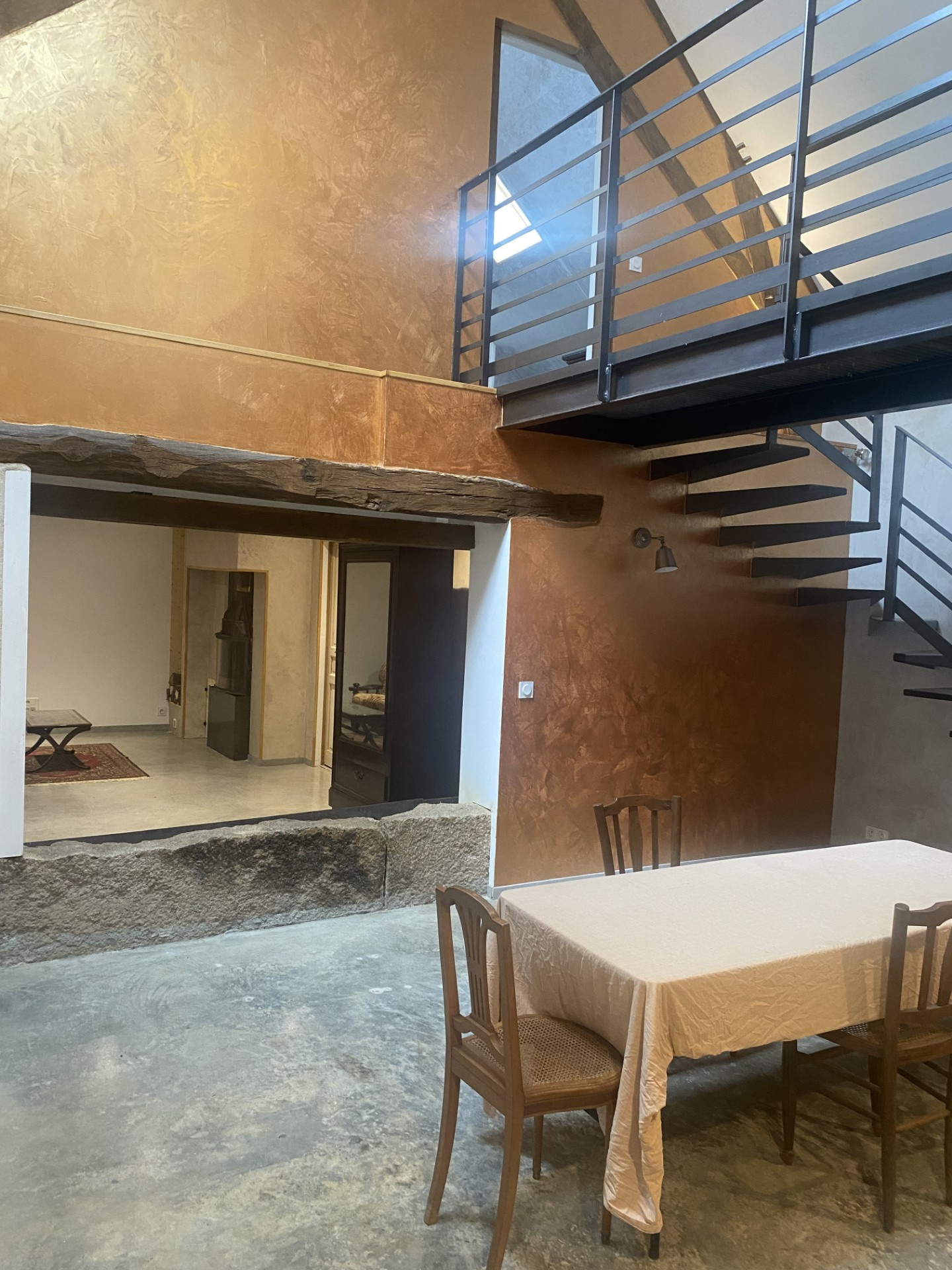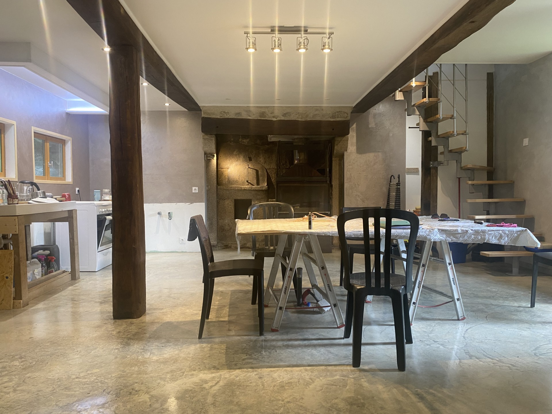 Cette maison de 140 m2 environ se compose au rez-de-chaussée : d’une grande cuisine dînatoire avec four à pains et cheminée (insert) de 35 m2 environ, séjour cathédrale de 35 m2 environ, salon avec insert, salle de bains avec wc.